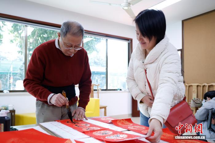 1月7日,浙江杭州,市平易近抄写秋联。当日,杭州市暮年举动中央举行迎新秋要旨举动,市平易近们脚写秋联战祸字欢迎丙午马年,现场年味谦谦。中新社记者 肖健 摄