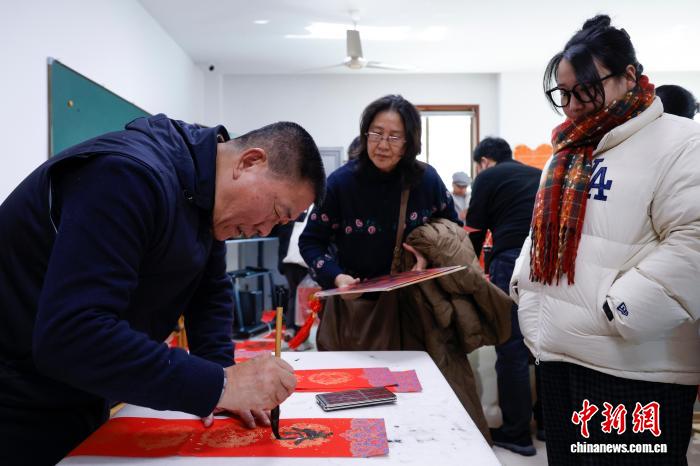 1月7日,浙江杭州,市平易近抄写秋联。当日,杭州市暮年举动中央举行迎新秋要旨举动,市平易近们脚写秋联战祸字欢迎丙午马年,现场年味谦谦。中新社记者 肖健 摄